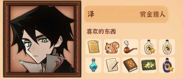 野花、火山女神木雕和松鼠可能是他的喜好。送给他这些会增加好感度。
