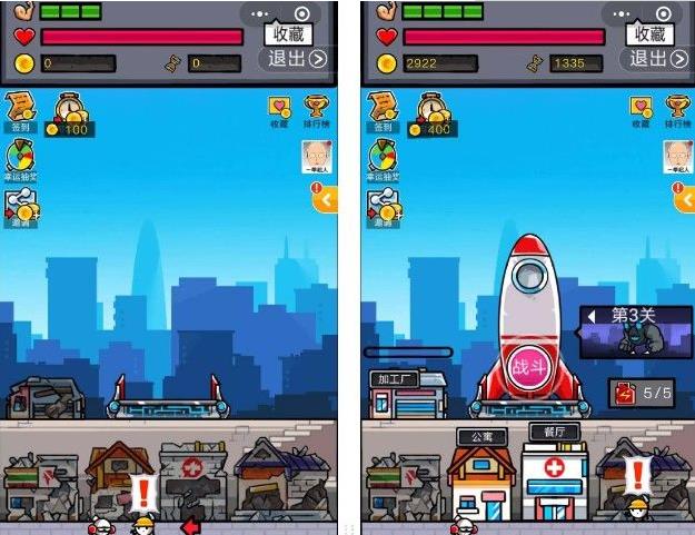 1、被敌人袭击过的家园破烂不堪,我们需要先修复公寓,去战斗消灭敌人再慢慢修复餐厅、加工厂等