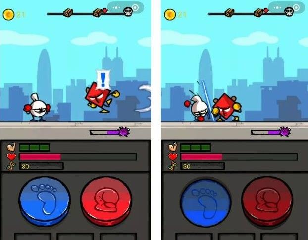 2、乘坐火箭到达战场开始战斗,热血细胞游戏里有两个红蓝两个按钮。红色按钮可以挥拳攻击敌人,蓝色按钮使出飞毛腿踢飞病菌