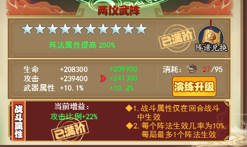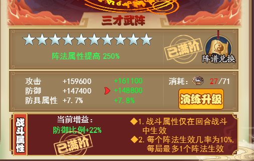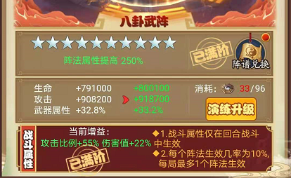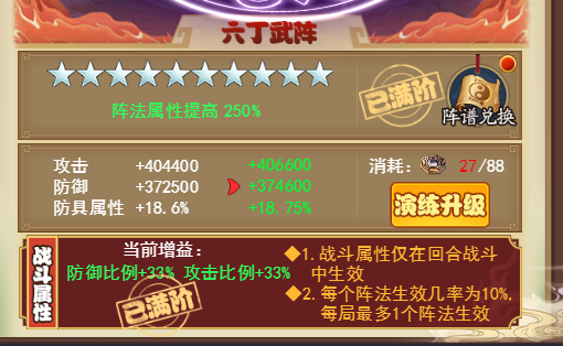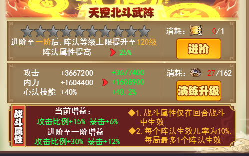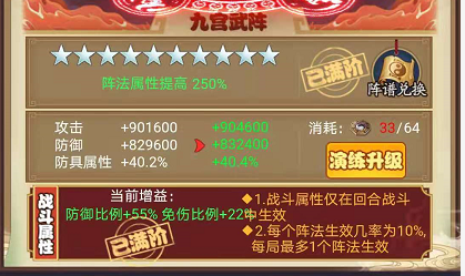 注:阵法7、8、9截图来自384区 南越白云庄,1-9阵满阶战斗属性在上图,天罡阵法目前还没有人有满阶,不清楚具体满阶战斗属性,因为都是未满级其他属性加成还不清楚,有机会再次补充。