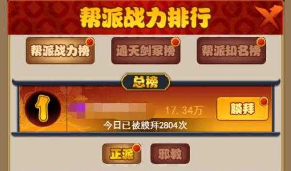 这个也是全部新手玩家进入游戏之后,最先可以获得金条的途径。进入游戏之后会强制要求玩家先走一遍江湖历练(主要也是为了能让玩家先熟悉一下基础玩法),可以先不用听指引去点游历,直接点主界面右上角的帮派图标,点进去弹出来的新页面有个排行榜的按钮,再点一下,出现排行榜。