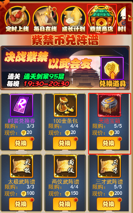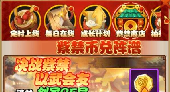 这个玩法要等紫禁之巅开启之后,每天晚上8点钟去参与紫禁之巅获得紫禁币之后去兑换商城兑换金条袋(一般前期兑换阵法的比较多)。一般情况下,紫禁商城7天刷新一次,每次刷新4个元宝袋,领完字后就只能下一个周期在领取了。每个月包袋可以打开100金条,也就是一周,紫禁币充足的情况下,兑换可以获得400金条,数量也是蛮可观的。
