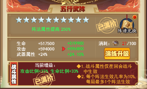 获取途径重大活动充值9999元获得一个(同时附赠超级武兽),如元旦、春节、五一、国庆就会开启;所有阵法满阶是十星,对战触发阵法有额外的加成,每个阵法加成都不一样,注意阵法的属性是平分给上阵的人物;