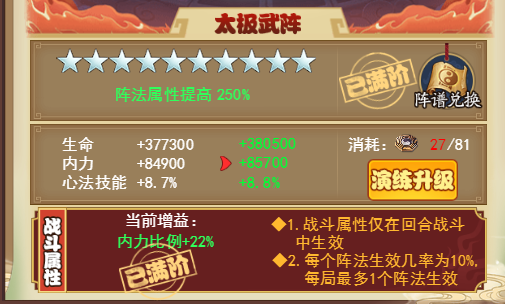 阵法堂: 太极-内力比例,两仪-攻击比例,三才-防御比例;获取途径紫禁商店购买,开启顺序建议是213;四象-内力比例+生命比例、五行-攻击比例+生命比例、六丁-防御比例+攻击比例,获取途径需要到达V5参与每天超值连充才能获得(大活动有机会白嫖);