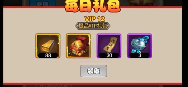 这个也是每个玩家每日必须领取的。如果是萌新玩家,那每天的量就比较少,只有5金条(蚊子再小也是肉呀喂!)。本着积少成多的原理,建议0氪的玩家还是要每天坚持领取!冲到了VIP1的话是可以VIP每日礼包是包含了20金条的。