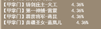 所以如果想要再提升几率的话,就要做第二个准备了,那就是尽快激活方外势力的抽奖。除了群豪外,方外也有各大掌门,例如抽到铸剑山庄庄主火工的概率是4.36%,还有第一神捕雷震,苗疆圣女-蓝凤凰等,概率都是一样的。