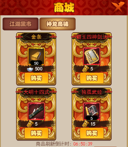 神龙商铺:每天更新两次,甲饰品、心法6个令牌,甲武器、防具、技能5个令牌,乙饰品不要兑换,通天会掉。另外还有机会500银两购买50金条,记得经常光顾一下。