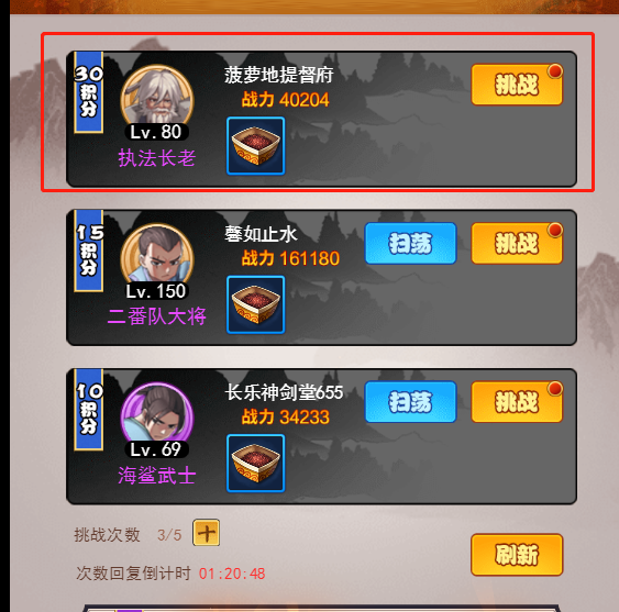 积分分为30、15、10;15和10积分可以扫荡,但是30积分只能挑战,默认是强力选手,我们可以点击刷新挑选战力低的选手进行挑战,三个奖励箱子10次挑战妥妥获得。