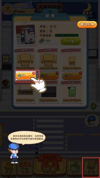 3、点击底部【装修】图标,选择餐桌进行升级,推进游戏进程。