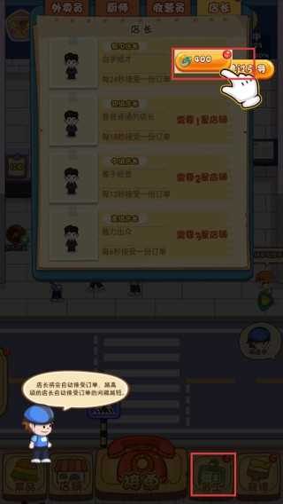 2、点击底部【员工】图标,进入界面后升级店长,提升员工效率。