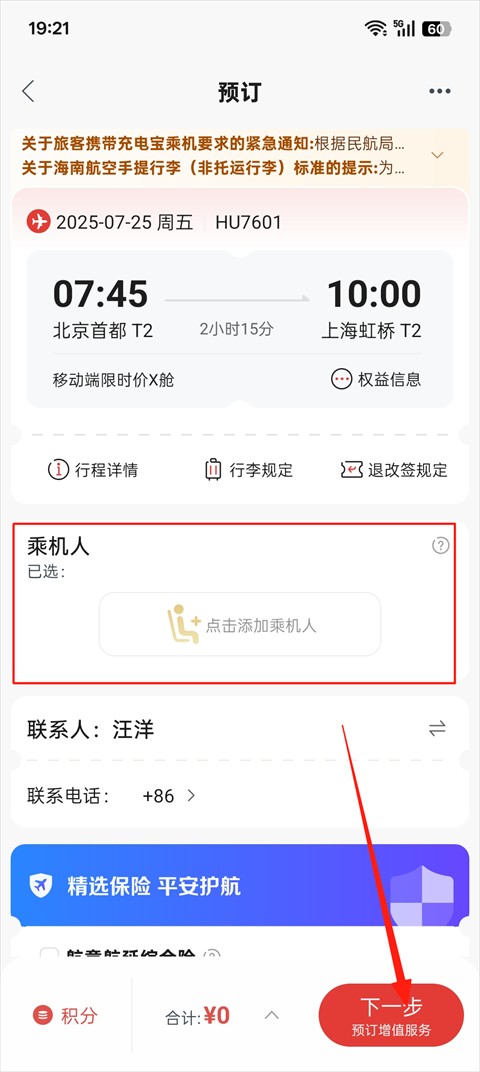 1、打开海南航空App,登录之后,点击要乘坐的航班