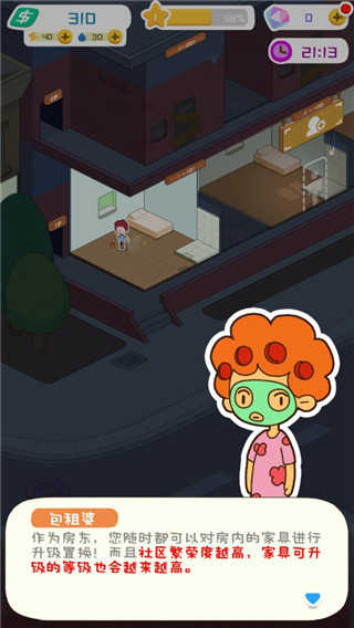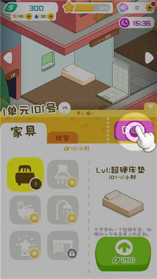 6.作为房东,您随时都可以对房内的家具进行升级置换,而且社区繁荣度越高,家具可升级的等级也会越来越高,升级了家具,租客们会自觉提高租金的。没有人能从包租婆手下占到便宜,这里点击您想要进行操作的房间,就可以查看和升级家具,让我们看看101室都有些啥吧;