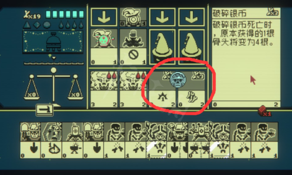 然后我们使用盗墓贼的能力,得到一个骷髅,把骷髅召唤,然后用左下角的摧毁功能,摧毁骷髅,由于死灵法师的效果,我们可以敲碎一个骷髅同时获得两个骨头,再用盗墓贼的能力用一骨头换两骨头,循环往复。