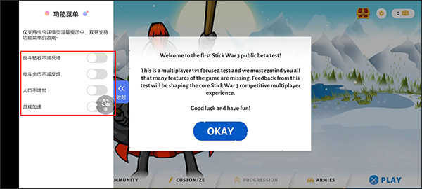 9、好了,游戏已经算是正是开启了,在左上方中有内置菜单功能,玩家们可以根据自己的需求,对自己的战争形势做出一个绝大的改变。