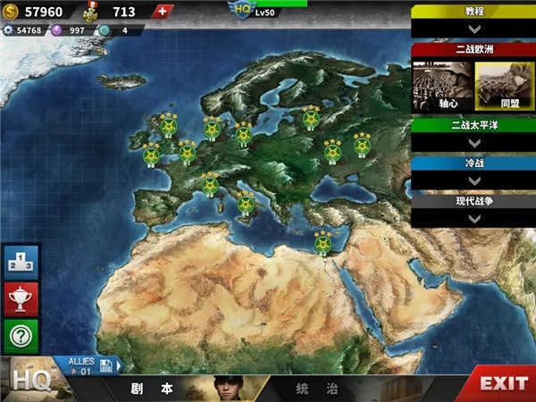 我们先讲述一下征服独有的功能键,首先是右上角的年代,其国家分布与对应年代相照应,也就是和同年正史上有很大的联系,大体可以分为二战前期 二战后期 冷战 现代战争,自然,每个年代都有自己独特的对立阵营,二战为轴心 同盟 冷战为华约 北约 现代战争为联合国 毒蝎恐怖组织(不可操控),难度会随着年代的靠后而逐层递增,并且每个年代(1939除外)都需要解锁——通关相应的剧情。
