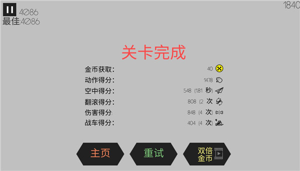 5、完成关卡会根据动作、翻滚、伤害获得评分