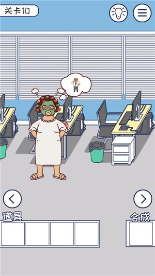 6、最左窗帘拿到假发最右窗帘拿到面具合成假发和面具把伪装道具拖到座位;BE:点最左冰箱下层或者最右柜台露出的半个头。