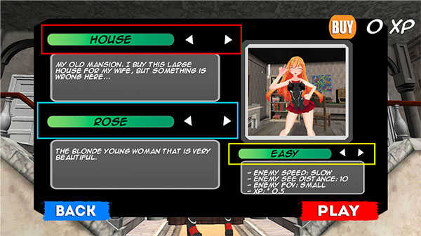 1.进入恐怖的妻子游戏,如下图,红框“house”可以切换场景地图,黄框“easy”可以调整游戏难度,蓝框“rose”可以切换不同形象的妻子,设定好后点击“PLAY”开始游戏。