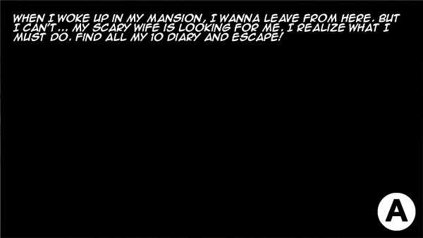 2.剧情大意:“当我醒来在我的豪宅,我想离开这里。但我不能…我吓人的妻子在找我,我意识到我必须做什么。找到我所有的10本日记并逃跑!”点击A继续。