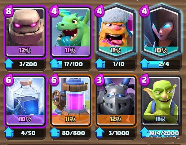 卡组:飞龙+巨人+骑士+火球+万箭齐发+弓箭手+炸弹人+哥布林投矛手。