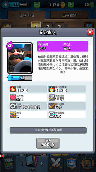 猎人:4滴圣水解锁,对近距离的目标伤害极高,我是用来防御对面的进攻,和对付空中目标。不适用与大范围卡组的攻击。这张卡可以替换成骑士/巨人/或者女武神。
