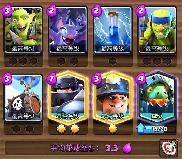 其中骷髅军团哥布林飞桶和火球、野蛮人滚桶、飞龙是必备的,骷髅墓碑和哥布林小屋可以二选其一,猎人可以替换成自己拿手的一张卡牌。
