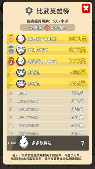 提示:奖励按最佳成绩的关卡数结算,与名次无关,结算时如为领取到奖励,请稍作等待或切换网络。