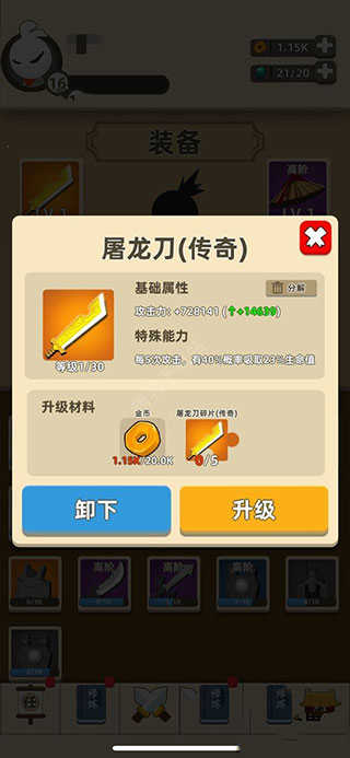 1、每解锁新的关卡,都能解锁更高阶的装备碎片(最高为史诗高阶),学习新的内功,随之而来的战斗力也会直线上升(新装备和内容的1级数值基本等于之前的10级以上数值)。