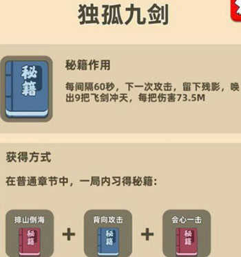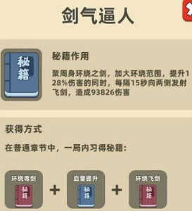 攻略三、秘籍选择:背向攻击、排山倒海、攻击力大、小、血量提升(有多少要多少)、隔山打牛、金钟罩、东风剑法、巨浪剑法、暴击、一阳指、战斗大师、会心一击、葵花宝典、长着祝福、二段伤害、吸血(武器选择吸血就不要也可以)有这些基本可以了。选择持续伤害的武器优先选择环绕毒剑、环绕飞剑。