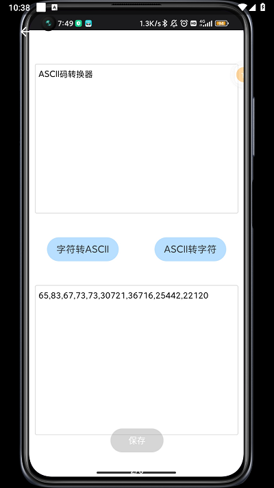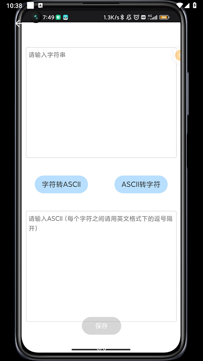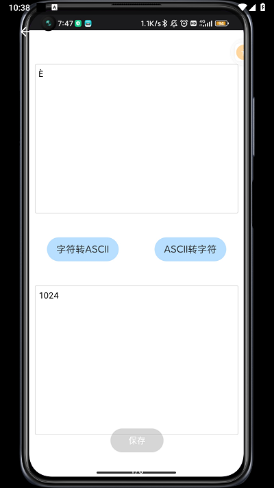 ASCII转换器app首页有两个空格,上面的空格提供的是字符转ASCII功能,下面的则是ASCII转字符。根据文字提示填写字符串或ASCII,点击中间的转换按钮即可。转换过程特别迅速,一秒就能得出转换结果!