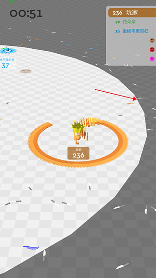 在游戏前期,玩家需要控制球体拾取地上散落的飞刀,拾取的飞刀越多积分就越高,战斗力就越高,玩家在右上角可以看到自己的积分排名。