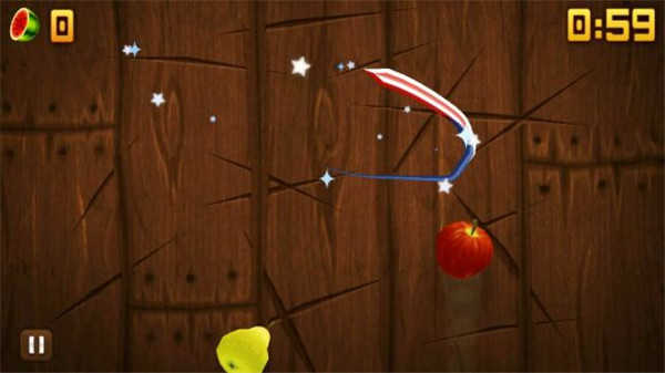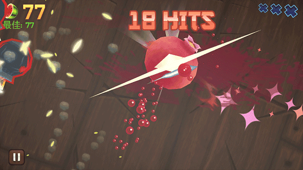3、一次削一个水果获得1分,一次连续削两个水果获得2分,一次连续削三个以上水果,出现Combo效果,获得本次所削水果数量两倍的分数。