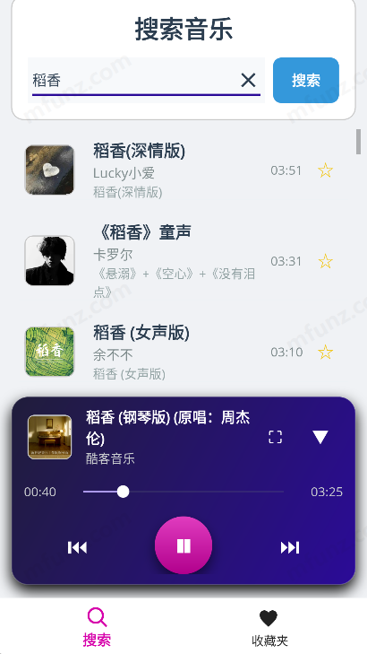 gomusic音乐播放器软件采用极简风格,界面看起来简约且高级,播放界面是悬浮在手机桌面上的,操作起来更加灵活且方便。提供的所有音乐都是免费的,喜欢的歌曲可添加到收藏夹中,下次直接在收藏夹就能找到你想听的歌曲!