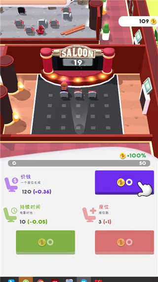 待客人买好零食之类的食物后,就会前往电影房间了,你可以升级房间,以赚取更多利润,随后你可以解锁更多电影房间来增加客人的容量,并且不同的电影房间会播放不同的电影,而这也是吸引顾客的重要途径。