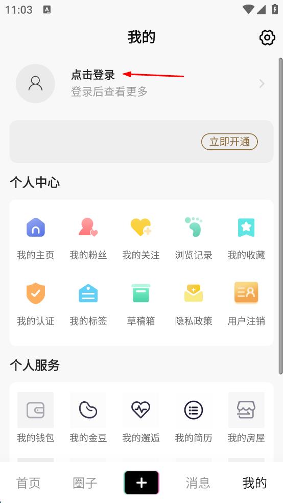 2、在个人页面上方,点击“点击登录”选项,进入账号密码登录界面。