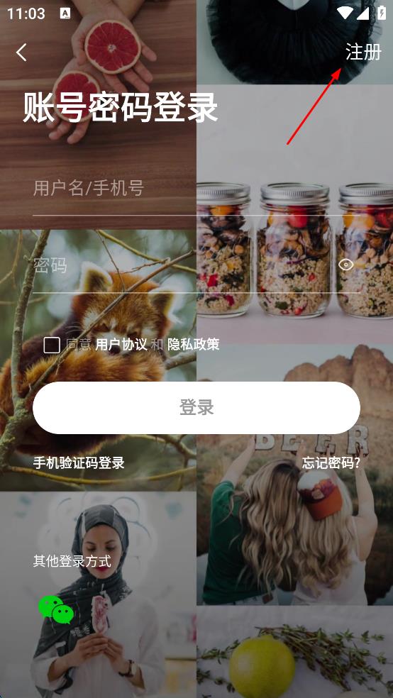 3、在账号密码登录界面右上角,点击“注册”选项,进入注册新账号页面。