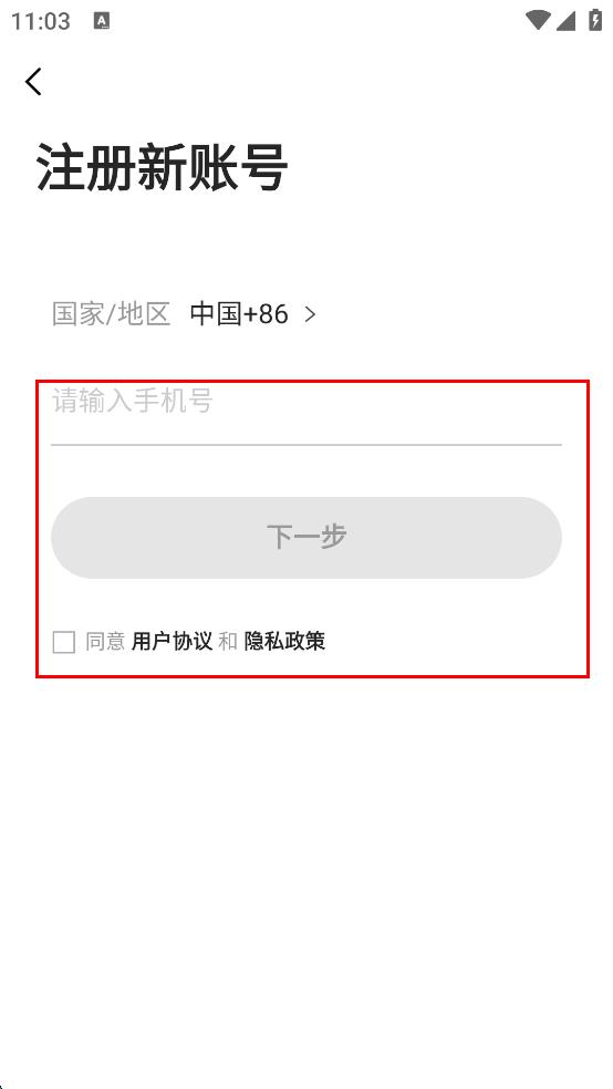4、在注册新账号页面,输入手机号,勾选同意用户协议和隐私政策后,点击“下一步”按钮,继续注册流程。