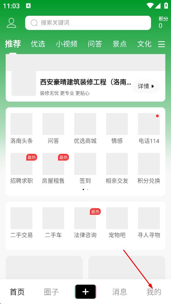 1、打开洛南生活类APP,在主界面右下角,点击“我的”选项,进入个人页面。