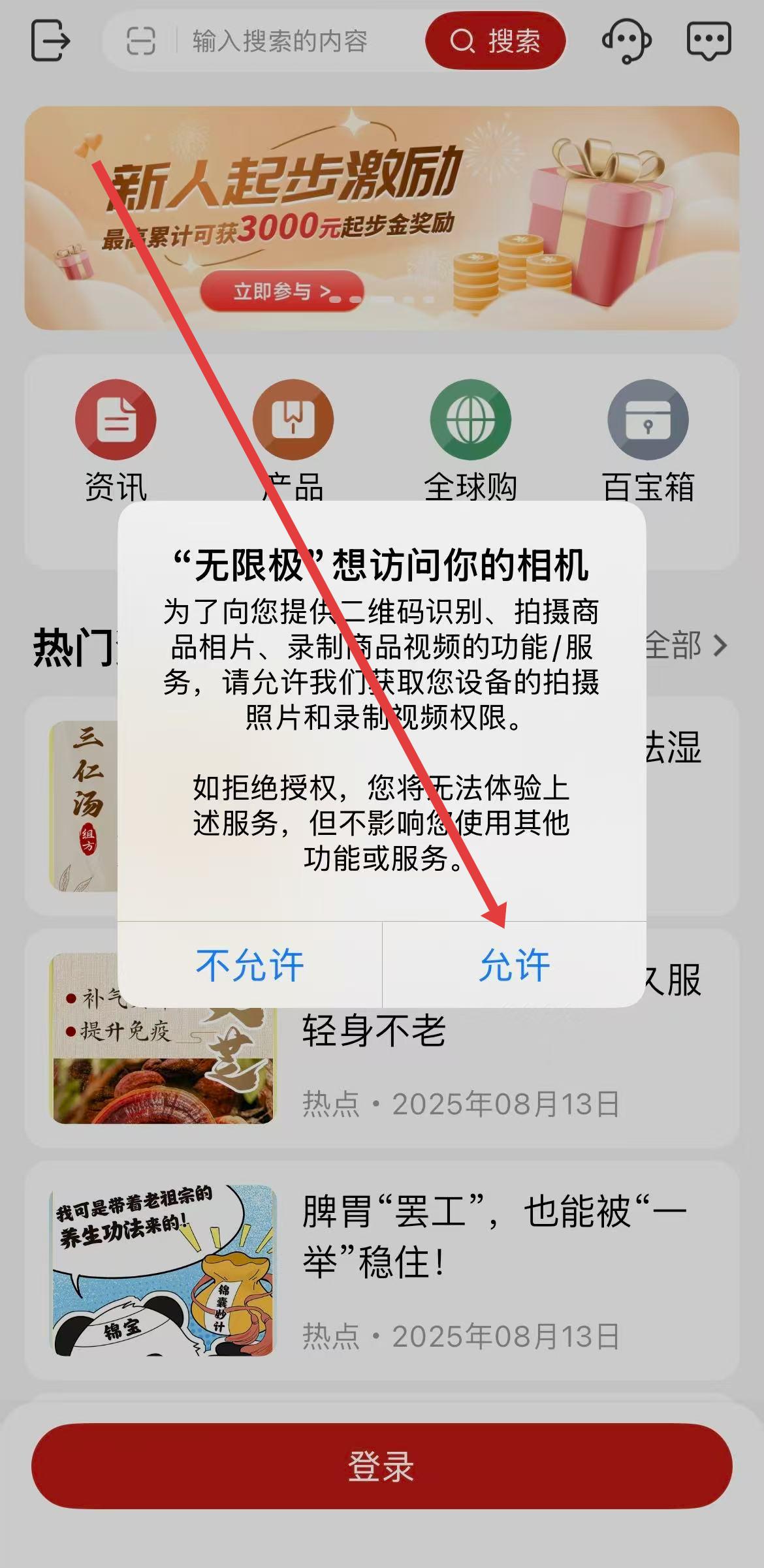 2、此时APP会弹出权限申请提示框,询问是否允许访问相机,点击允许,授予APP相机使用权限,若之前已授权,可跳过此步。