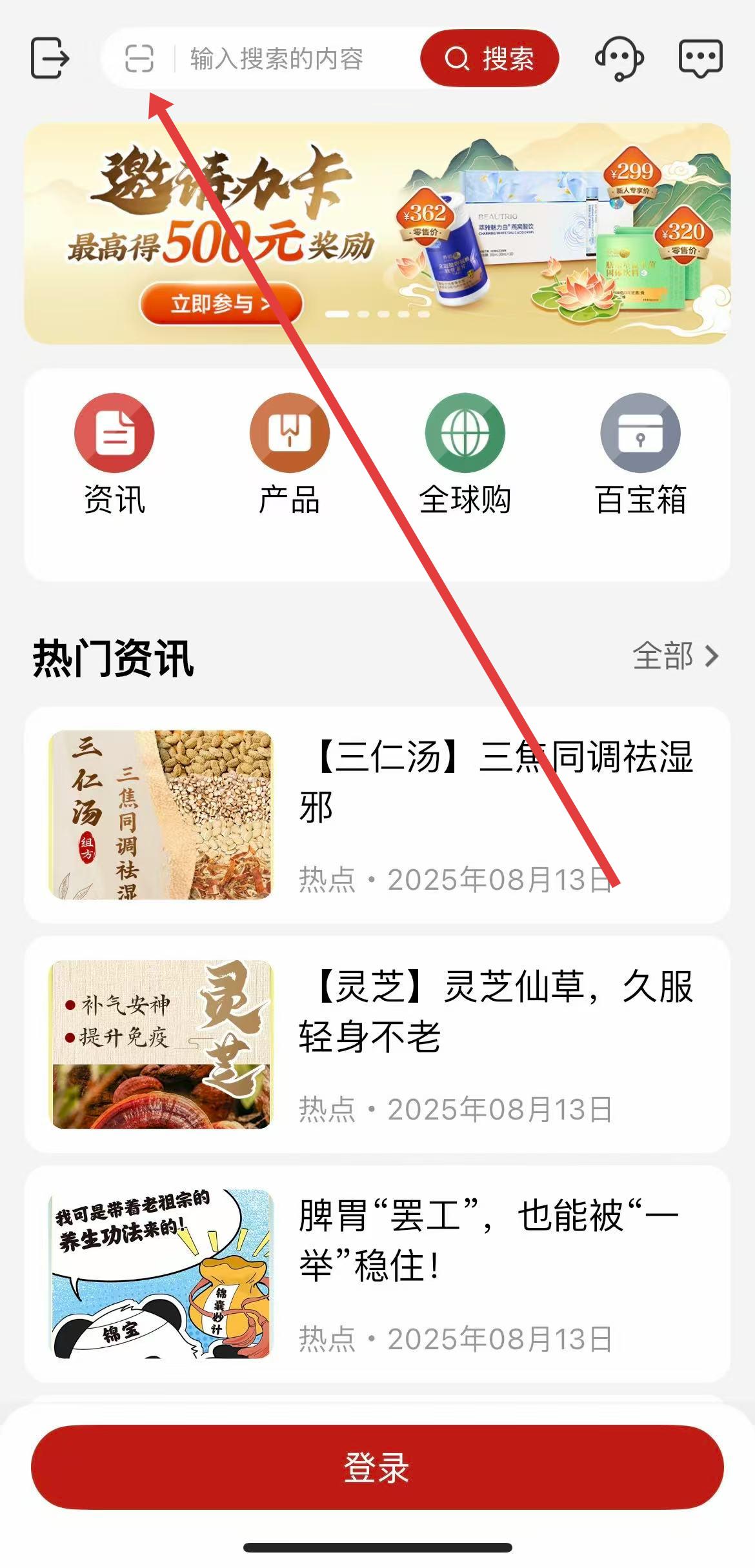 1、打开无限极APP,进入首页后,点击顶部的扫一扫图标,扫一扫位置在搜索栏顶端的左侧。