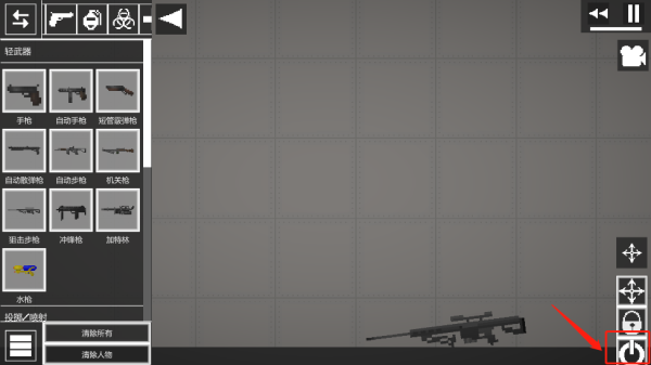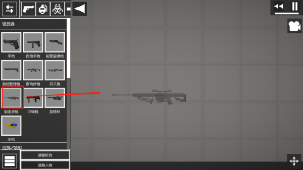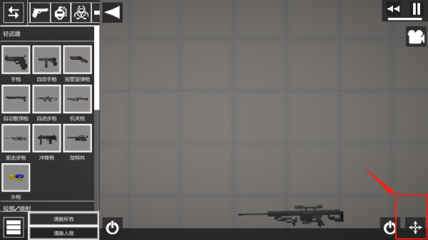 3、接着,我们在菜单界面,选择【枪】图标,选择一把拖动到地面上,