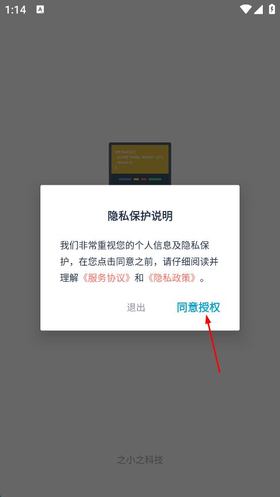 1、打开编程小之应用,会弹出隐私保护说明页面,仔细阅读后点击同意授权按钮。