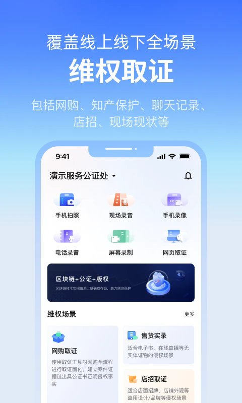 1、点击首页,集成手机拍照、录像等取证功能,涵盖电商侵权监测等,展示多维权场景。