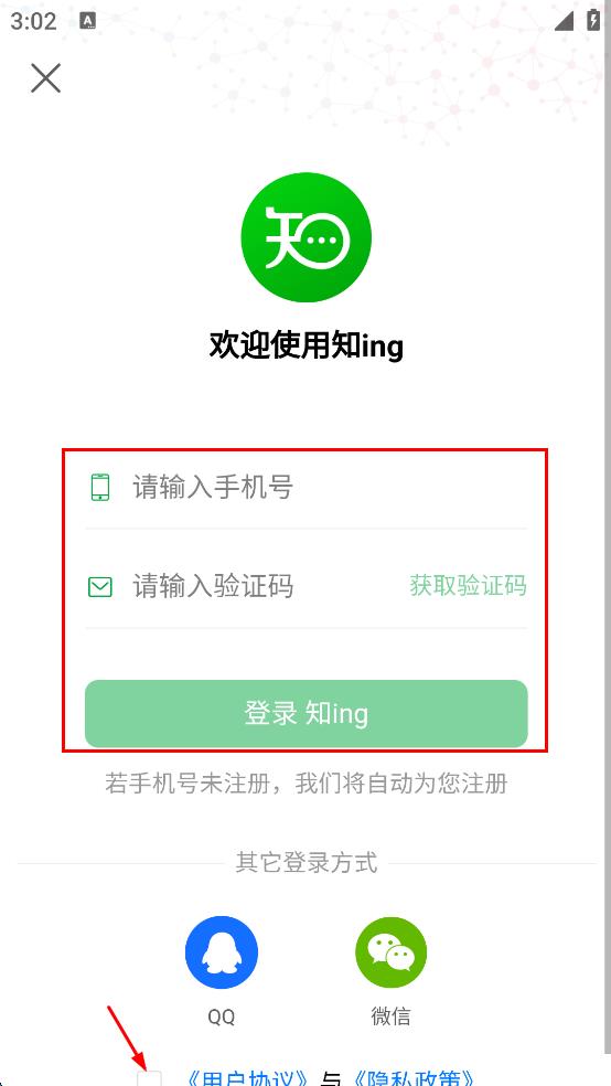 4、在登录界面,输入手机号,获取并填写验证码,勾选相关协议后点击登录知ing按钮。