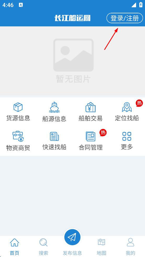2、在长江船运网主界面,点击右上角“登录/注册”,进入登录界面。