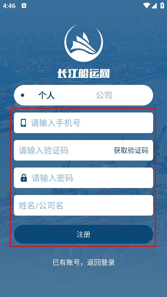 4、在注册页面,依次输入手机号、验证码、密码以及姓名或公司名,然后点击“注册”,即可完成长江船运网的注册。