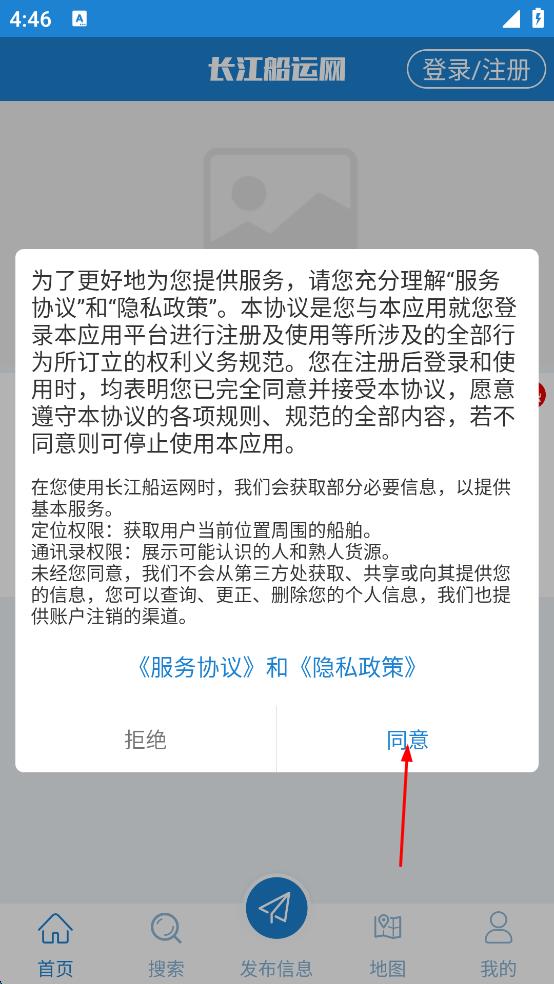 1、打开长江船运网,在弹出的服务协议和隐私政策提示框中,点击“同意”,进入长江船运网主界面。