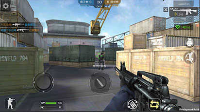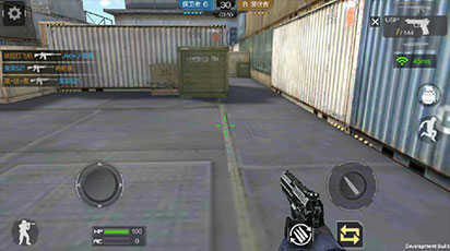 游戏画面左下角和右下角各有一个圆圈状的虚拟按钮,玩家通过滑动虚拟按钮控制人物的动作。其中左下角的虚拟按钮控制移动 右下角的虚拟按钮控制准星和射击。同时,在画面左侧还分布有战绩查询、蹲下、换背包等按钮,画面右侧分布有跳跃、切换主/ 副武器、换子弹等按钮。
