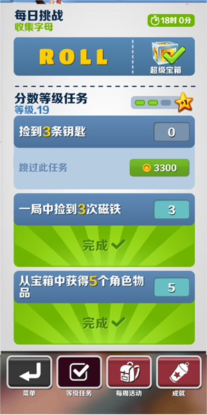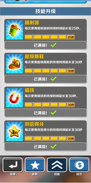 再其次的就是我们的技能要给他升满,玩上一个星期,可以陆陆续续把他升完,因为很显然升完级之后,他的技能时间也会增长,特别是双倍得分,磁铁,喷射器,这几个非常重要,在天上的难度是比地上简单很多的,甚至可以说是毫无难度,加上磁铁和二倍得分,分数自然而然就上去了,而且上手极快,无需任何技巧。