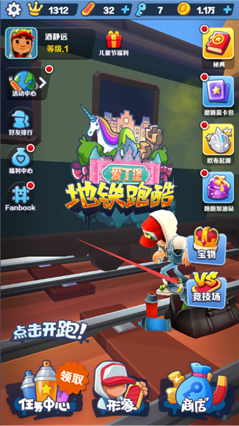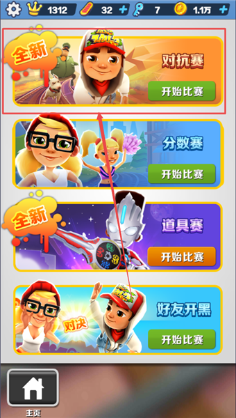 1、下载安装好地铁跑酷,运行游戏,此版本的玩法和《地铁跑酷》相似,只不过这次的跑酷主角换成了保安大叔,玩家需操纵角色抓捕逃跑的杰克,在首页面点击竞技场;